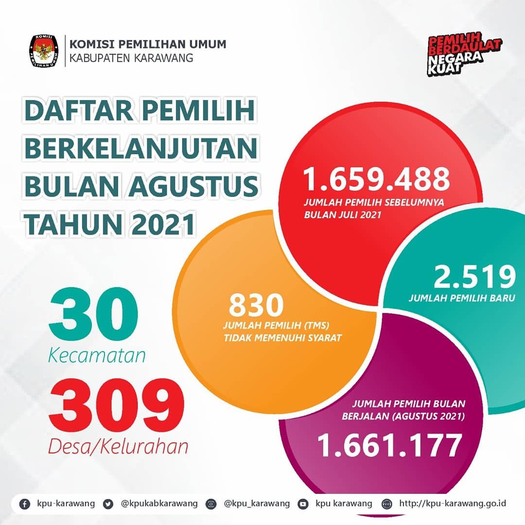 Jumlah pemilih bulan berjalan ini tersebar di 30 kecamatan dan 309 desa atau kelurahan di seluruh Kabupaten Karawang. Jumlah daftar pemilih berkelanjutan ini akan terus diperbarui untuk memastikan data pemilih terus ter-update dan hak warga negara sebagai pemilih tetap terlindungi.