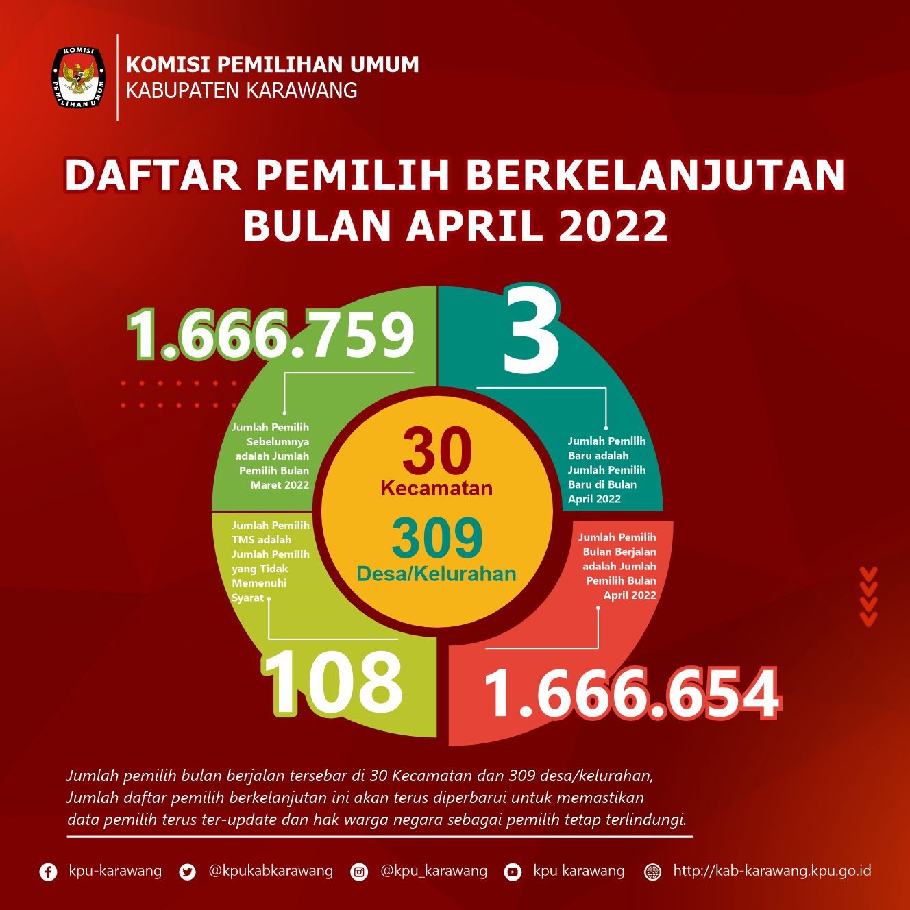 Senin 25 April 2022, KPU Kabupaten Karawang telah melaksanakan Rapat Koordinasi Daftar Pemilih Berkelanjutan (DPB) periode Bulan April bertempat di Aula Kantor KPU Kabupaten Karawang. Hal ini dibukukan dalam berita acara dengan Nomor:9/PK.01/3215/2022 tentang Rapat Koordinasi Daftar Pemilih Berkelanjutan Tahun 2022 Periode Bulan April.
