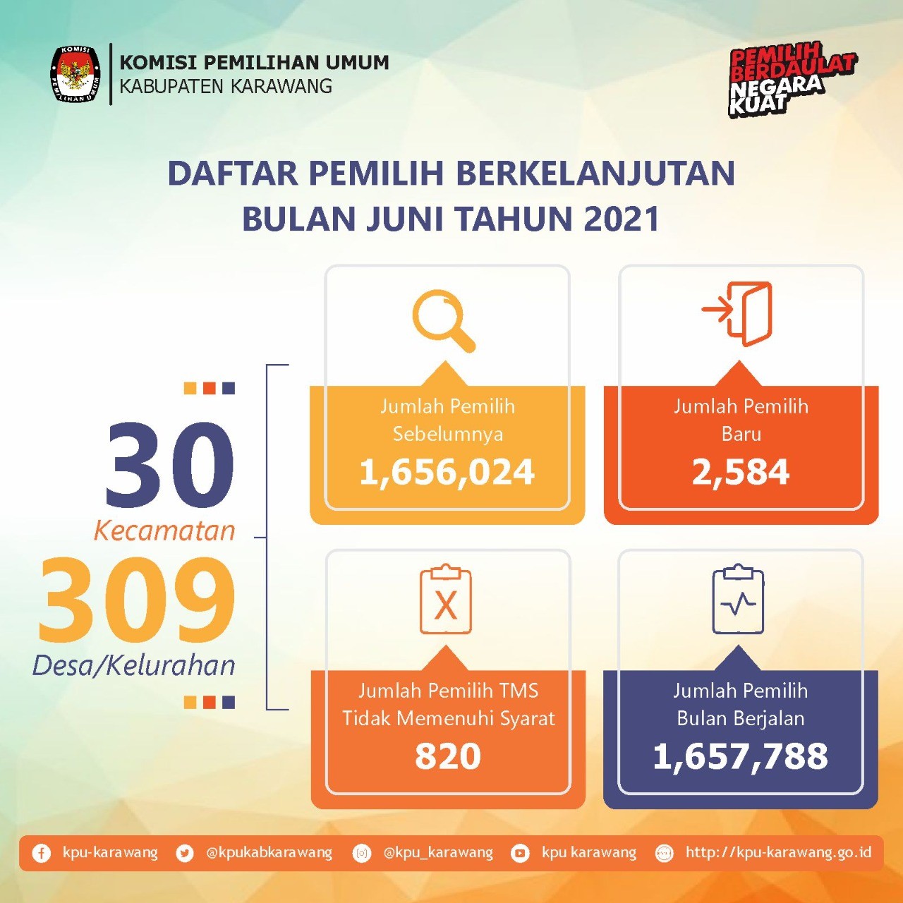 Pada hari rabu 30 Juni 2021, KPU Kabupaten Karawang kembali melakukan Rapat Koodinasi Daftar Pemilih Berkelanjutan Periode Bulan Juni 2021. Rapat dilakukan secara virtual dan dipimpin oleh Bapak Ikhsan Indra Putra, Ketua Divisi Program, Data dan Informasi KPU Kabupaten Karawang.