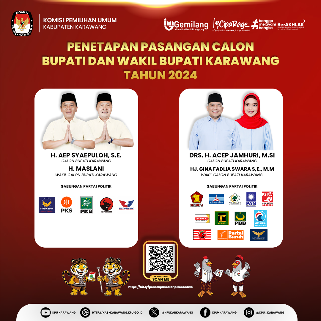 - Pasangan Calon atas nama Drs. H. Acep Jamhuri, M.Si. dan Hj. Gina Fadlia Swara, S.E., M.M. yang diusulkan oleh Partai Hati Nurani Rakyat, Partai Amanat Nasional, Partai Golongan Karya, Partai Gerakan Indonesia Raya, Partai Persatuan Pembangunan, Partai Demokrat, Partai Kebangkitan Nusantara, Partai Buruh, Partai Garda Republik Indonesia, Partai Bulan Bintang, Partai Solidaritas Indonesia dan Partai Gelombang Rakyat Indonesia dengan menggunakan jumlah perolehan suara sah DPRD Kabupaten Karawang pada Pemilu Tahun 2024 sebanyak 731.956 suara sah.