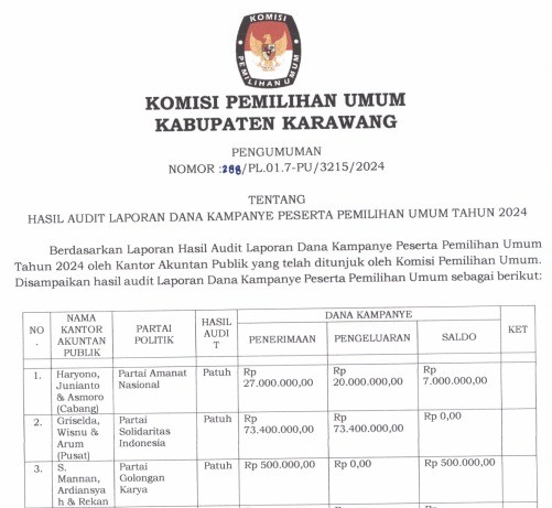 Berdasarkan Laporan Hasil Audit Laporan Dana Kampanye Peserta Pemilihan Umum Tahun 2024 oleh Kantor Akuntan Publik yang telah ditunjuk oleh Komisi Pemilihan Umum. Disampaikan hasil audit Laporan Dana Kampanye Peserta Pemilihan Umum sebagai mana terlampir dalam pengumuman ini.