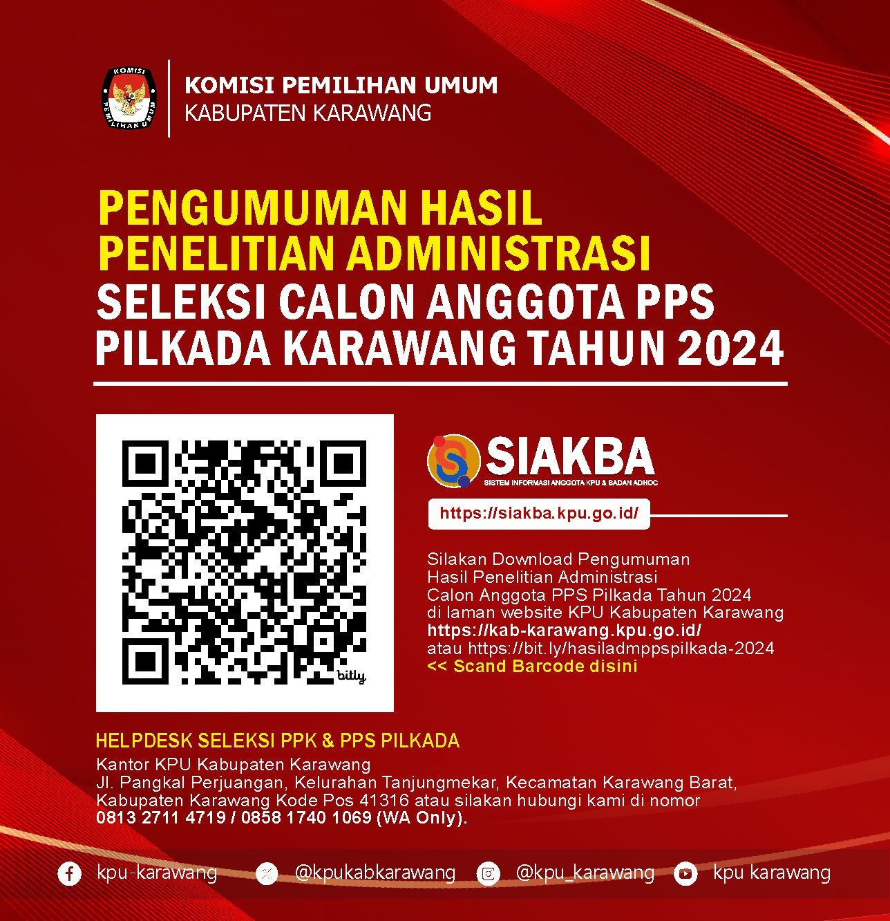 Sehubungan dengan Komisi Pemilihan Umum Kabupaten Karawang telah melaksanakan tahapan Penelitian Administrasi Calon Anggota Panitia Pemungutan Suara untuk Pemilihan Gubernur dan Wakil Gubernur, dan Bupati dan Wakil Bupati Tahun 2024, disampaikan beberapa hal sebagai berikut: