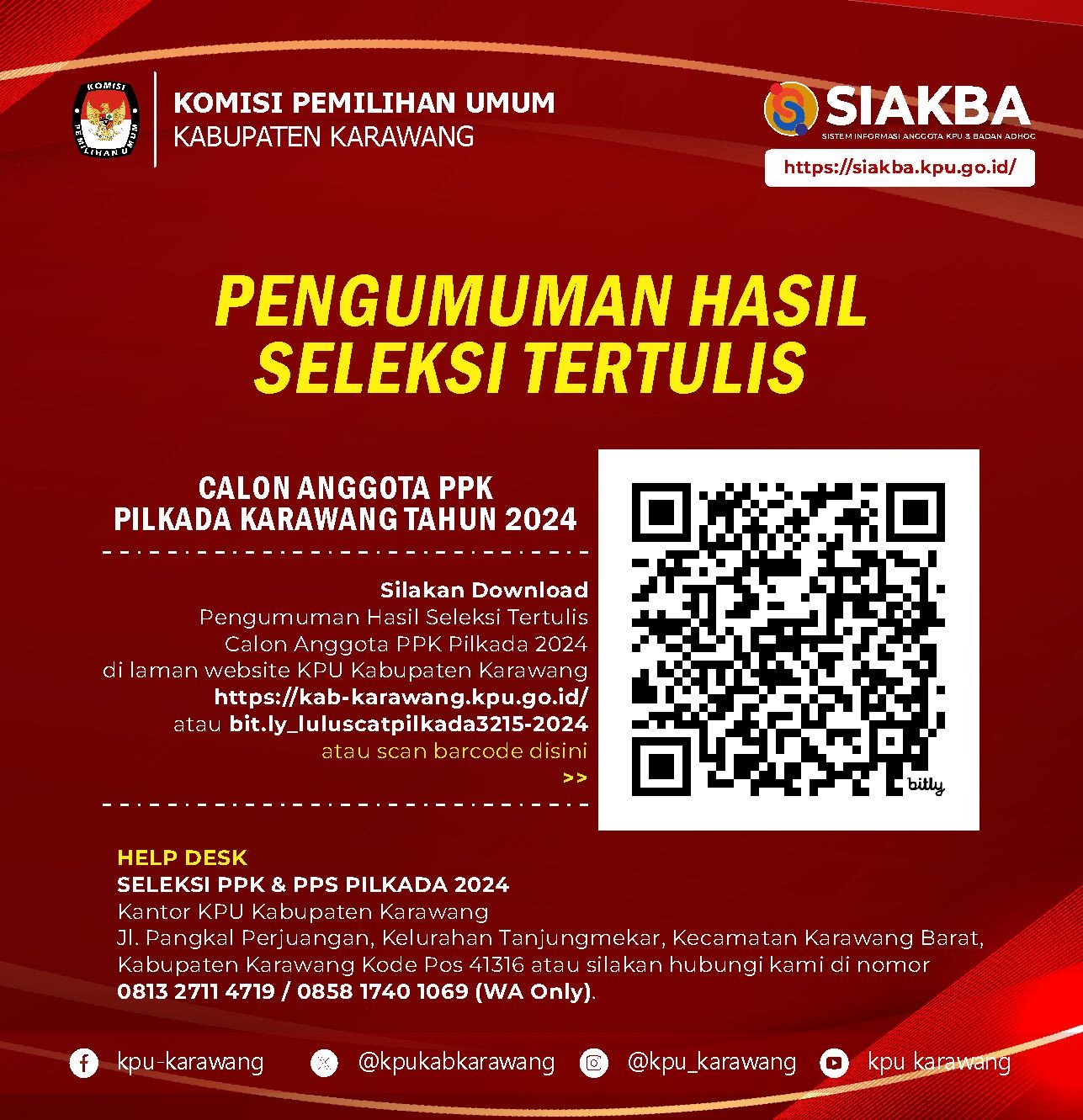 Informasi lebih lanjut perihal pelaksanaan seleksi tertulis dan tanggapan dan masukan masyarakat dapat disampaikan melalui Sekretariat Komisi Pemilihan Umum Kabupaten Karawang.