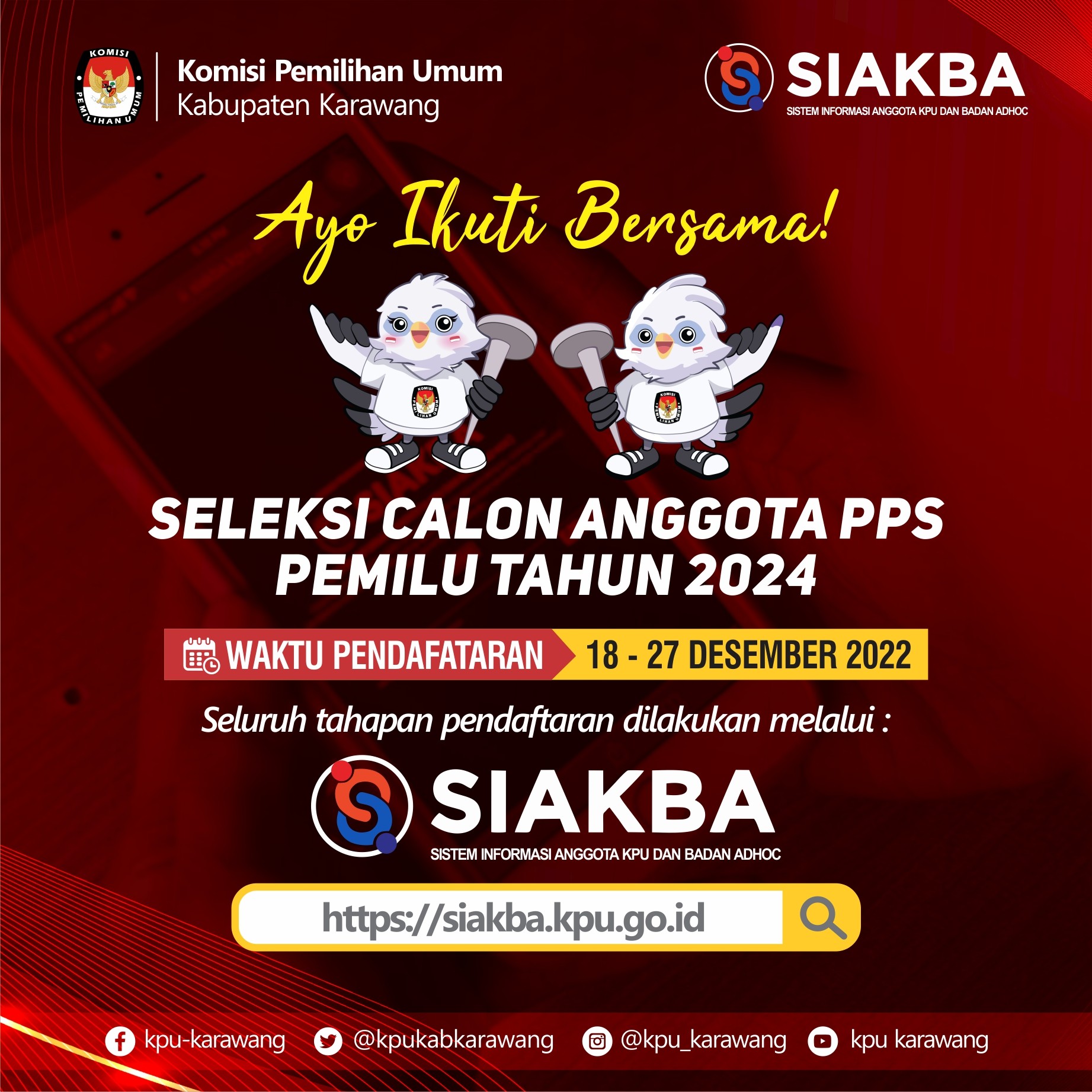- Surat Pendaftaran dan kelengkapan dokumen disampaikan kepada KPU Kabupaten Karawang sejak tanggal 18 Desember 2022 sampai dengan tanggal 27 Desember 2022 pukul 16.00 WIB, melalui SIAKBA ( http://siakba.kpu.go.id).