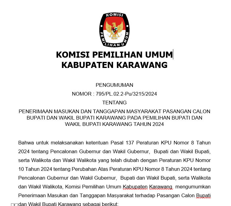 Bahwa untuk melaksanakan ketentuan Pasal 137 Peraturan KPU Nomor 8 Tahun 2024 tentang Pencalonan Gubernur dan Wakil Gubernur, Bupati dan Wakil Bupati, serta Walikota dan Wakil Walikota yang telah diubah dengan Peraturan KPU Nomor 10 Tahun 2024 tentang Perubahan Atas Peraturan KPU Nomor 8 Tahun 2024 tentang Pencalonan Gubernur dan Wakil Gubernur, Bupati dan Wakil Bupati, serta Walikota dan Wakil Walikota, Komisi Pemilihan Umum Kabupaten Karawang mengumumkan Penerimaan Masukan dan Tanggapan Masyarakat terhadap Pasangan Calon Bupati dan Wakil Bupati Karawang sebagai berikut: