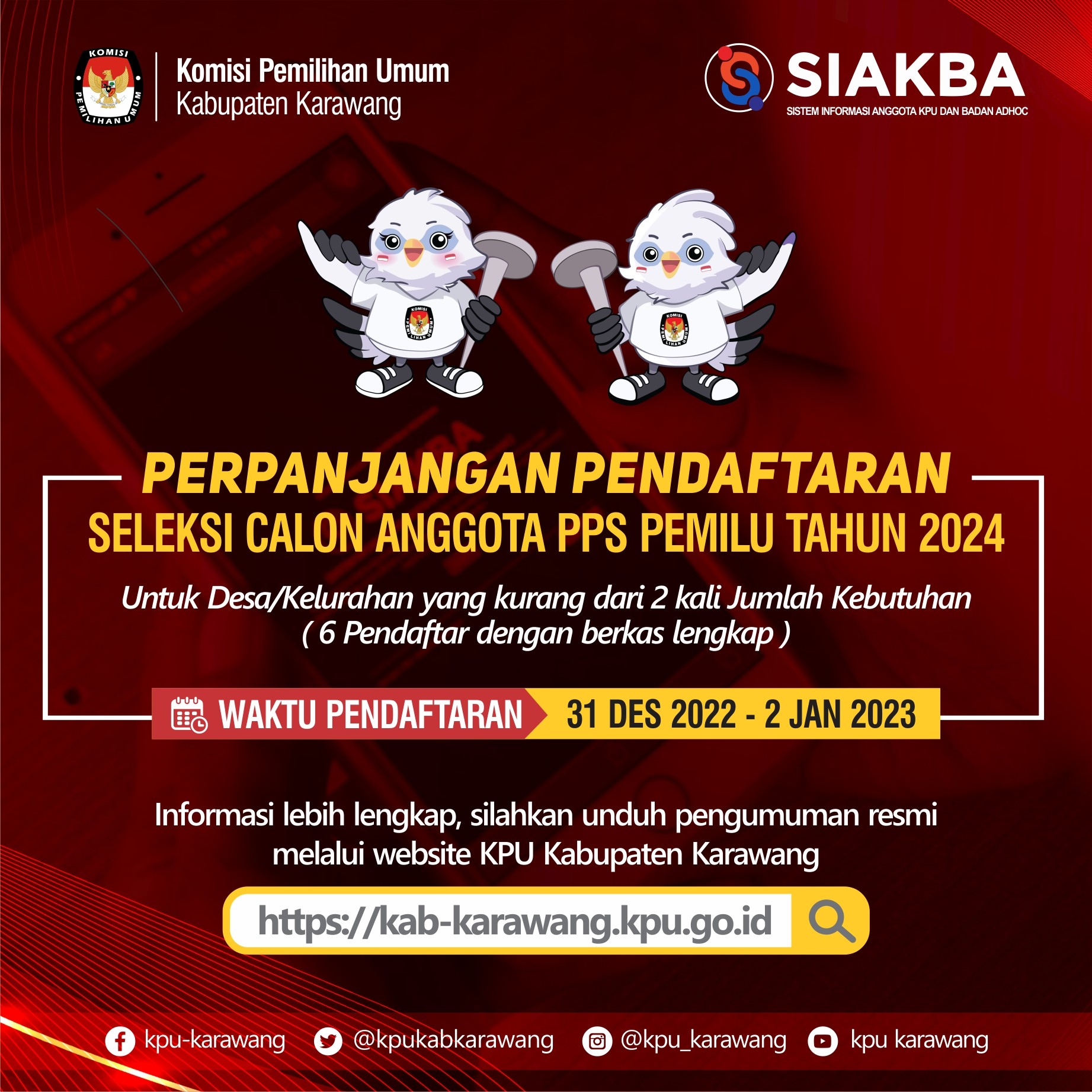 Sehubungan dengan hal tersebut, KPU Kabupaten Karawang membuka perpanjangan waktu pendaftaran seleksi calon anggota Panitia Pemungutan Suara terhadap Kelurahan/Desa yang pendaftarnya kurang dari 2 (dua) kali jumlah PPS yang dibutuhkan, sebagaimana terlampir dalam pengumuman. Adapun Waktu penerimaan Pendaftaran mulai tanggal 31 Desember 2022 sampai dengan Januari 2023, Pukul 08.00 sampai dengan 16.00 WIB