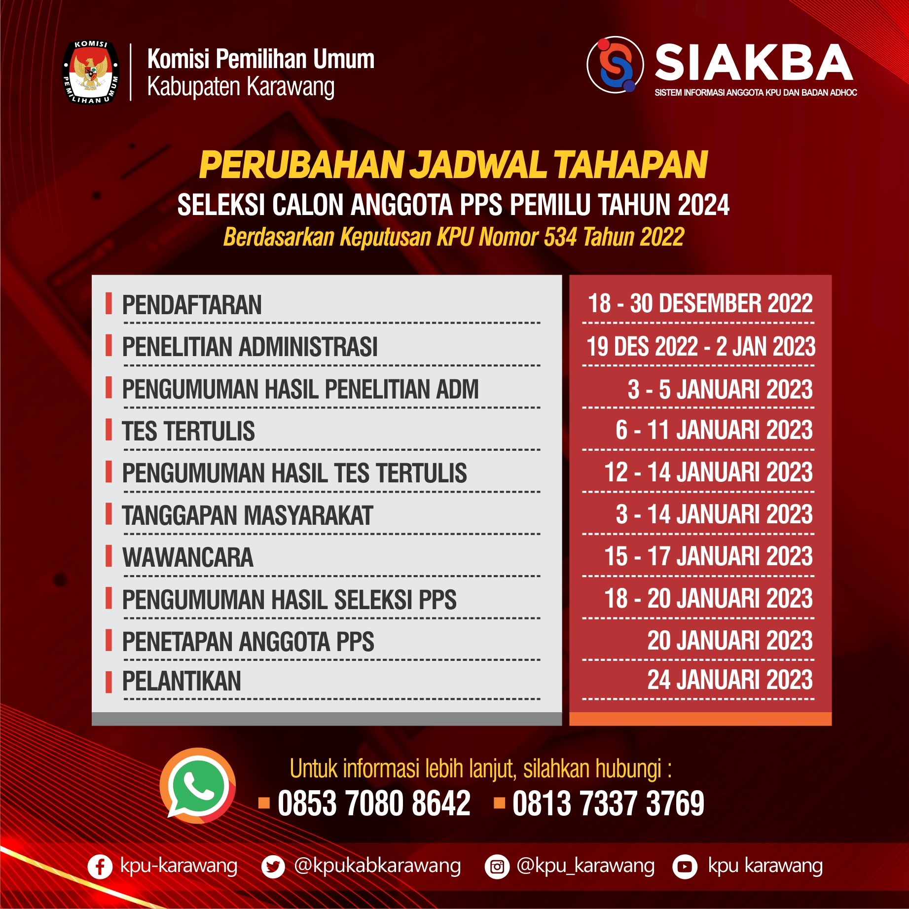 Sehubungan dengan telah ditetapkannya Keputusan Komisi Pemilihan Umum Nomor 534 Tahun 2022 tentang Perubahan atas Keputusan Komisi Pemilihan Umum Nomor 476 Tahun 2022 tentang Pedoman Teknis Pembentukan Badan Adhoc Penyelenggara Pemilihan Umum dan Pemilihan Gubernur dan Wakil Gubernur, Bupati dan Wakil Bupati, Walikota dan Wakil Walikota, bersama ini kami sampaikan perubahan jadwal Tahapan Pembentukan Panitia Pemungutan Suara (PPS) untuk Pemilihan Umum Tahun 2024, sebagaimana terlampir dalam pengumuman.