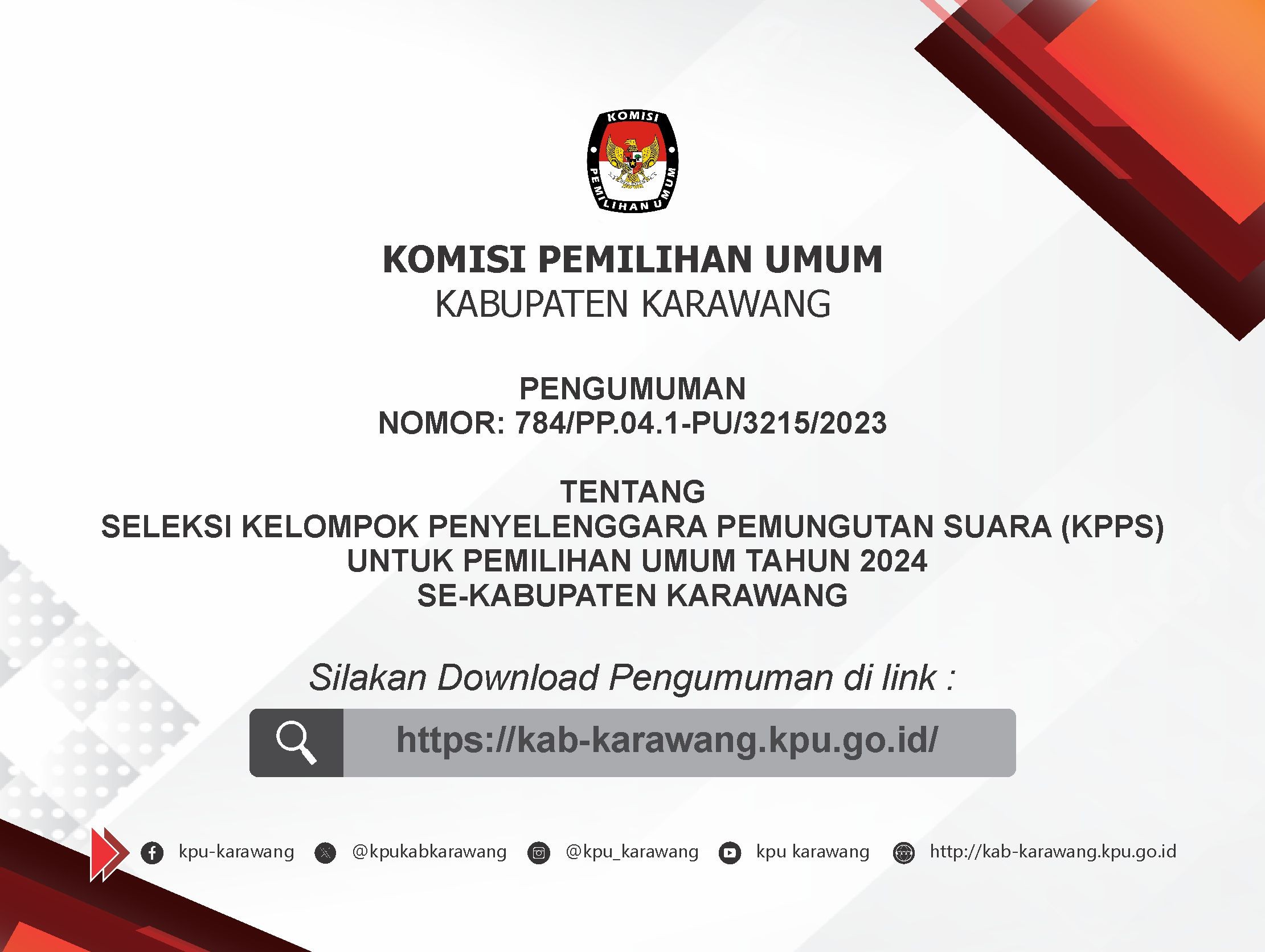 Dalam rangka pembentukan Kelompok Penyelenggara Pemungutan Suara (KPPS) untuk Pemilihan Umum Tahun 2024, Komisi Pemilihan Umum Kabupaten Karawang melalui Panitia Pemungutan Suara Desa/Kelurahan se-Kabupaten Karawang mengundang Warga Negara Indonesia yang memenuhi kualifikasi untuk mendaftarkan diri menjadi KPPS untuk Pemilihan Umum Tahun 2024 dengan ketentuan sebagai berikut: