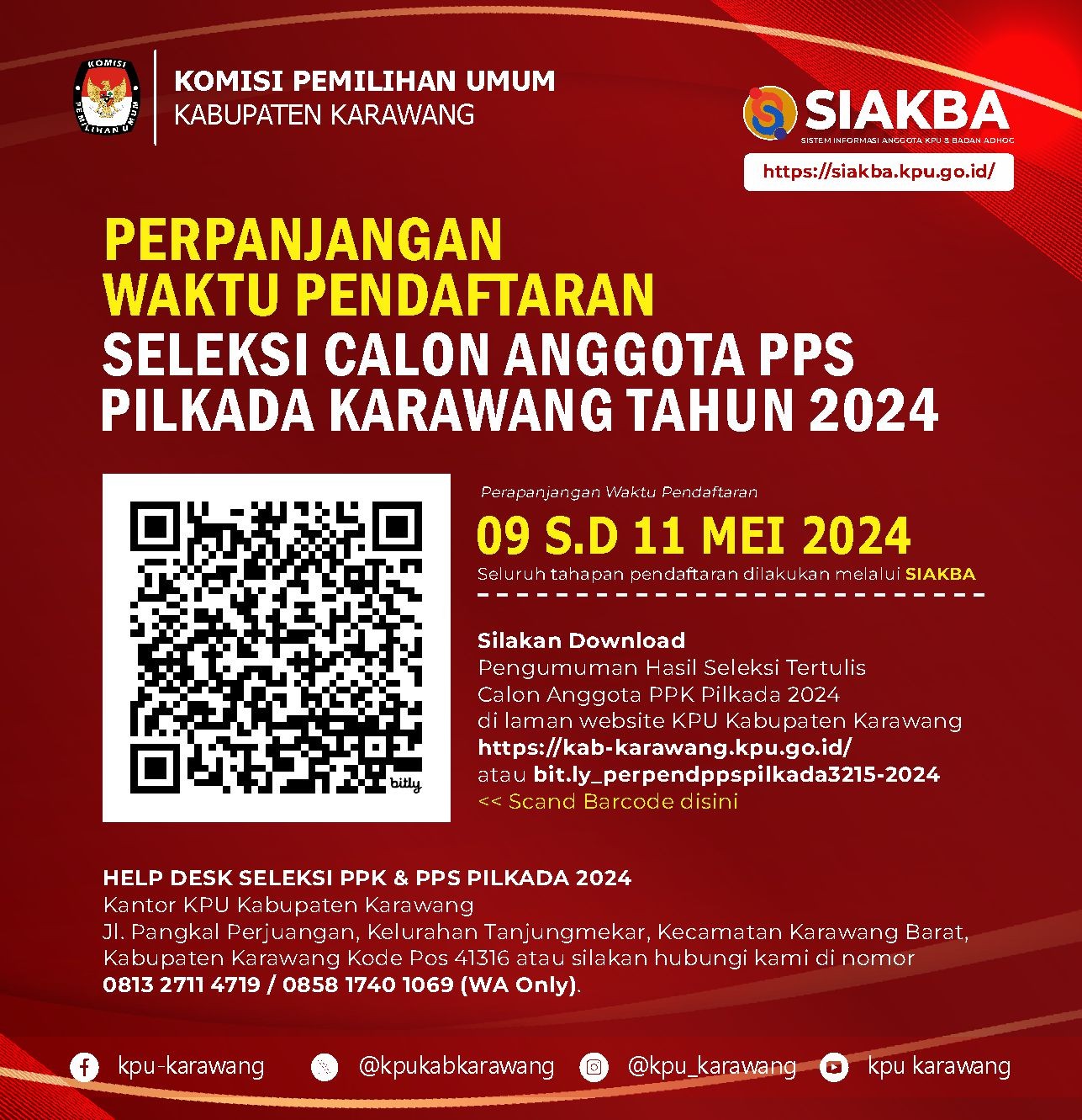 Sehubungan dengan hal tersebut, Komisi Pemilihan Umum Kabupaten Karawang, membuka perpanjangan waktu pendaftaran seleksi calon anggota PPS sejak tanggal 9 Mei 2024 sampai dengan tanggal 11 Mei 2024 pada Kelurahan/Desa sebagaimana tercantum dalam Lampiran Pengumuman yang merupakan bagian tidak terpisahkan dari Pengumuman ini.