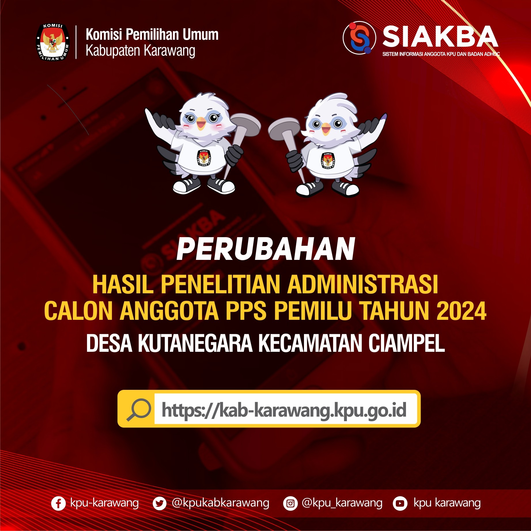 Berdasarkan Berita Acara Rapat Pleno KPU Kabupaten Karawang Nomor 2/PP.04.1/3215/2023 tanggal 6 Januari 2023 tentang Perubahan Hasil Penelitian Administrasi Calon Anggota Panitia Pemungutan Suara (PPS) pada Desa Kutanegara Kecamatan Ciampel dalam Pemilihan Umum Tahun 2024. Atas dasar tersebut, KPU Kabupaten Karawang menetapkan perubahan hasil seleksi administrasi calon Anggota Panitia Pemungutan Suara pada Desa Kutanegara Kecamatan Ciampel dalam Pemilihan Umum Tahun 2024. Selengkapnya silahkan unduh pengumuman resmi dibawah ini.