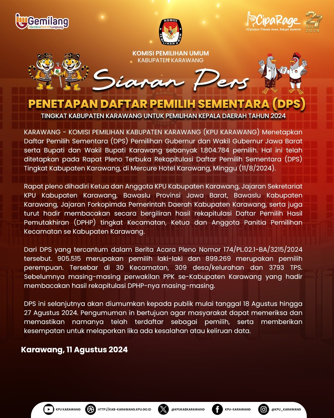 Siaran Pers Penetapan DPS dalam Pemilihan Kepala Daerah Serentak Tahun 2024 Selasa, 13 Agustus 2024 07:00 509 Download SK Penetapan disini Bagikan: Dilihat 509 Kali.