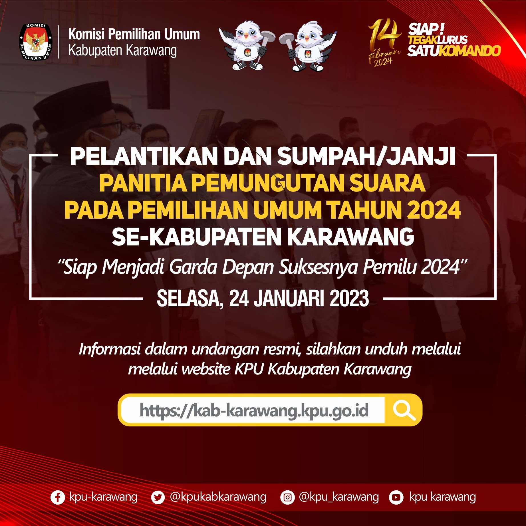 Berdasarkan Pengumuman KPU Kabupaten Karawang Nomor 150/PP.04.1-PU/3215/2023 tentang Penetapan Hasil Seleksi Calon Anggota Panitia Pemungutan Suara (PPS) pada Pemilihan Umum Tahun 2024 di Kabupaten Karawang, bersama ini kami sampaikan undangan kepada Calon Anggota Panitia Pemungutan Suara (PPS) Terpilih Peringkat 1 s.d 3 untuk mengikuti proses Pelantikan dan Sumpah/Janji Panitia Pemungutan Suara pada Pemilihan Umum Tahun 2024 yang akan dilaksanakan pada Hari Selasa, 24 Januari 2024 bertempat di Mercure Hotel Karawang. Informasi selengkapnya dapat diunduh undangan resmi dibawah ini
